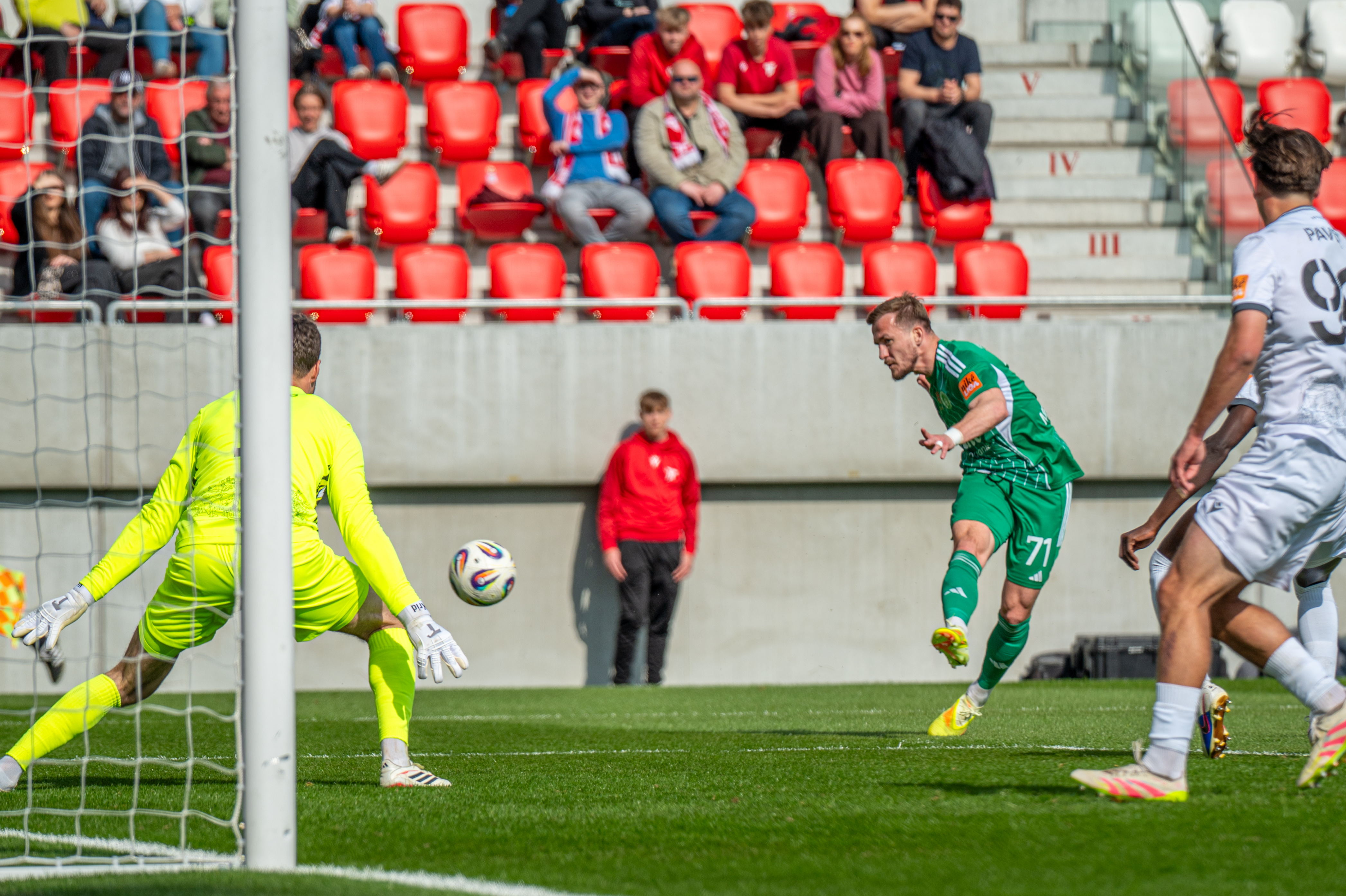 V 72. minúte registrujeme vynikajúci obranný zákrok Jozefa Menicha na rýchleho Dylanna Khama. Hneď však loptu strácame a domáci dokázali z následnej akcie zakončiť – z ľavej strany z hranice šestnástky to vyskúšal Brandis.