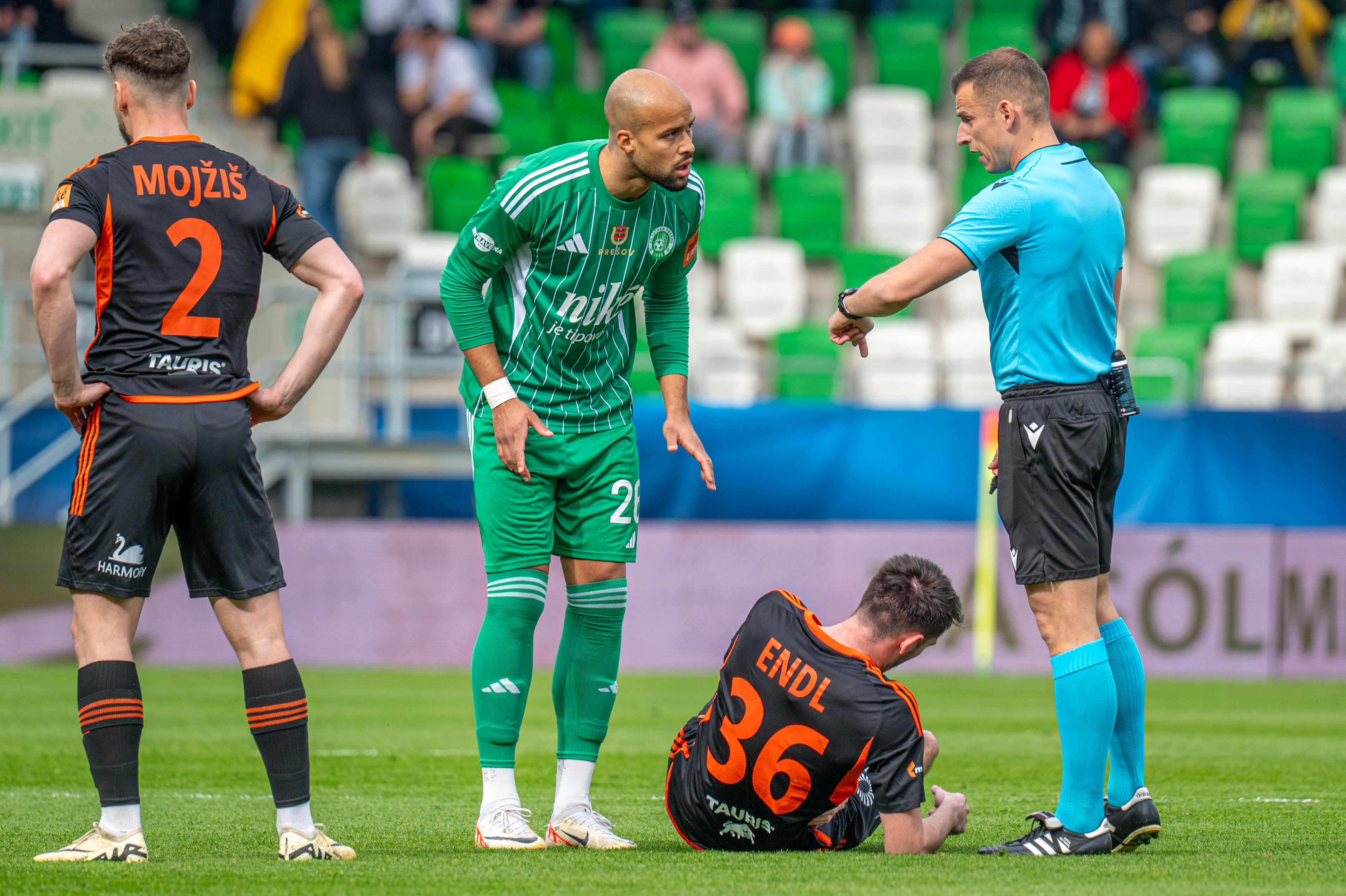 Brankár Húska ťahá v ťažkej pohode čas. Snáď si s tým hlavný rozhodca bude vedieť v nasledujúcich minútach poradiť.