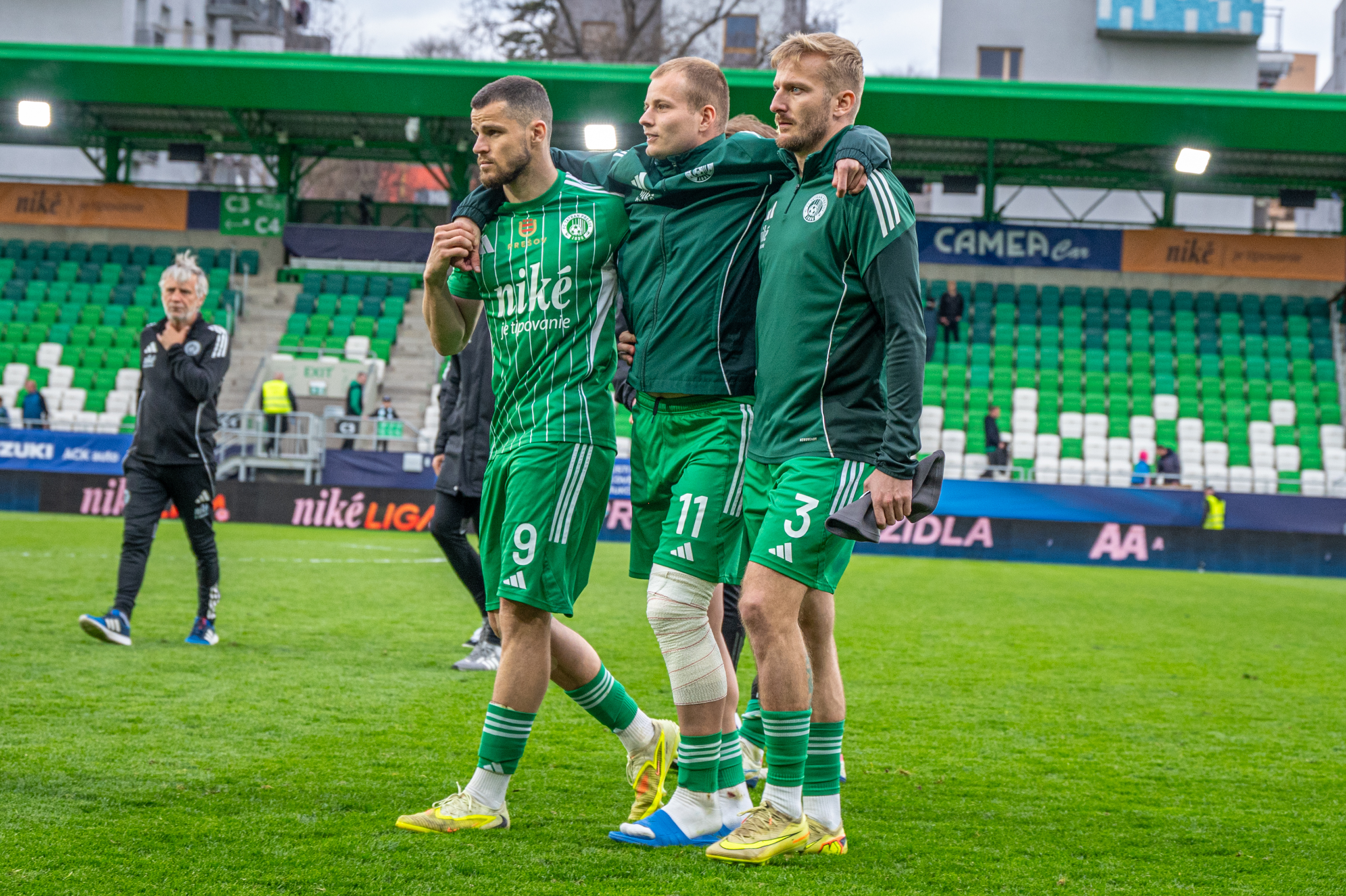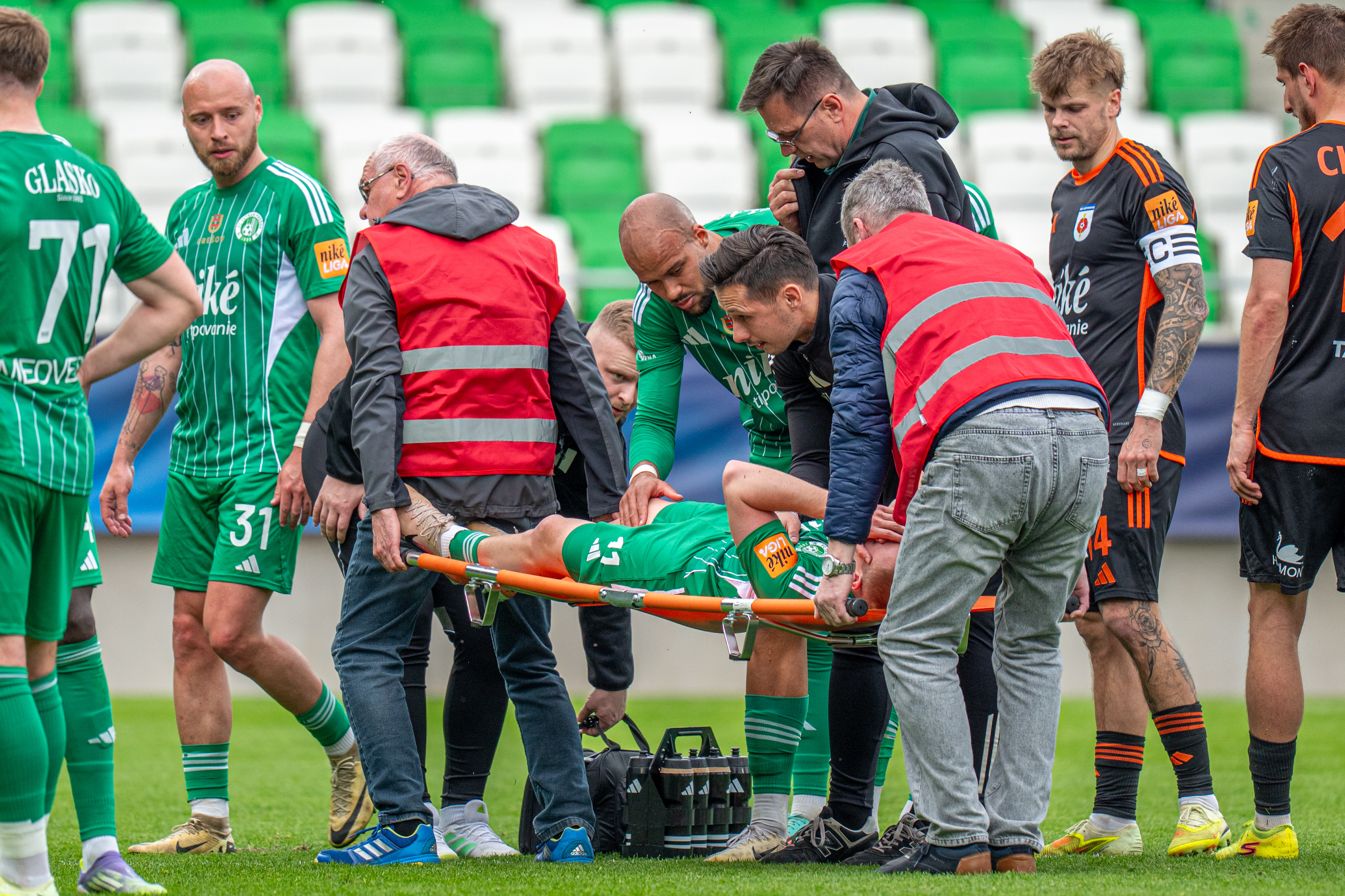 V 43. minúte stíchol celý štadión po hlavičkovom súboji Stana Olejníka na poliacej čiare - vzdušný súboj, dopad na vystretú nohu z veľkej výšky, výkrik, zvíjanie sa v obrovskej bolesti, nosidlá, slzy - toto nevyzerá vôbec, ale že vôbec dobre.