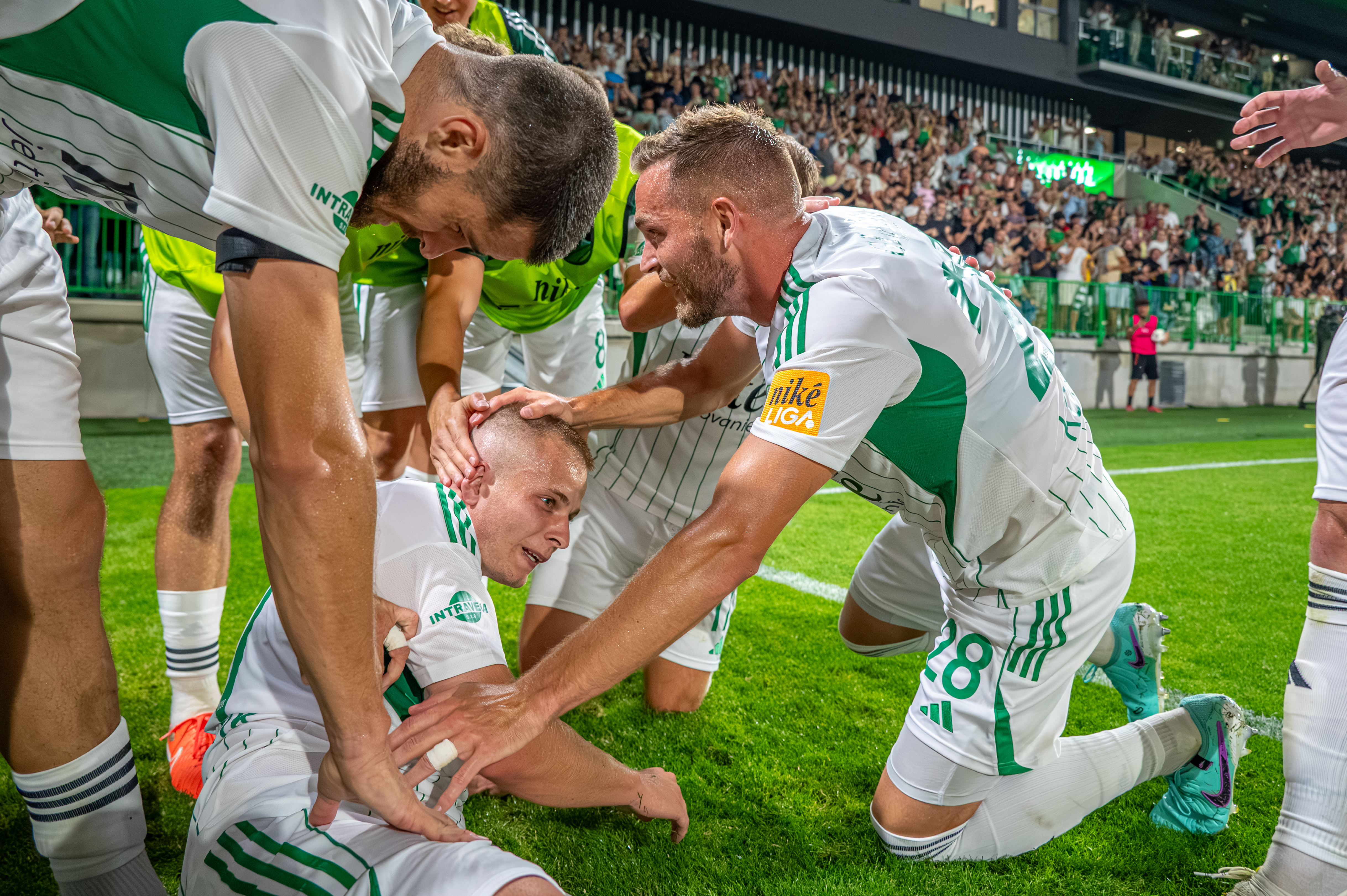 Oslava parádneho gólu Stana Olejníka proti Slovanu - Juraj Kotula s číslom 28 na drese
