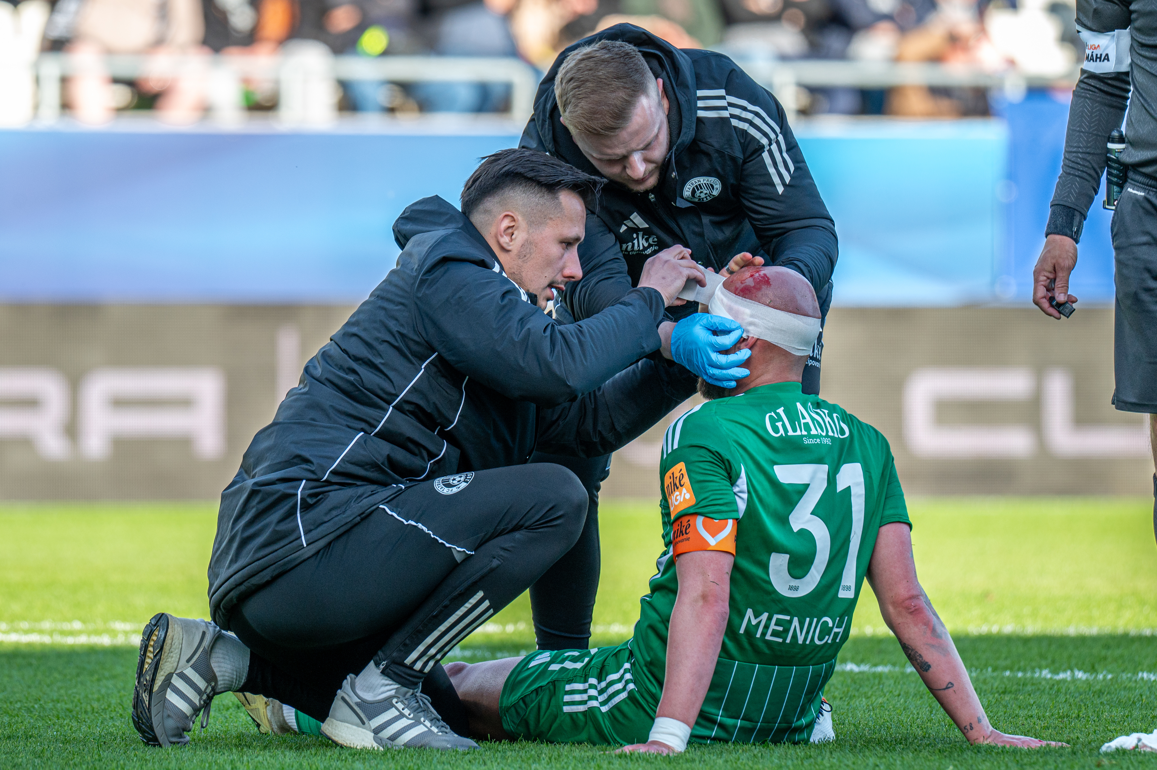 Dlhší čas sa nehrá po tom, ako vo vzdušnom súboji na hranici šestnástky došlo k stretu medzi Menichom a Vidíme veľa krvi a náš lekár Tadeáš Gmitter i fyzio Lukáš Valíček majú plné ruky práce. Za autovú čiaru schádza s obviazanou hlavou, ale aj s pokrikom od Miša Sipľaka: „Jožo, poď!“