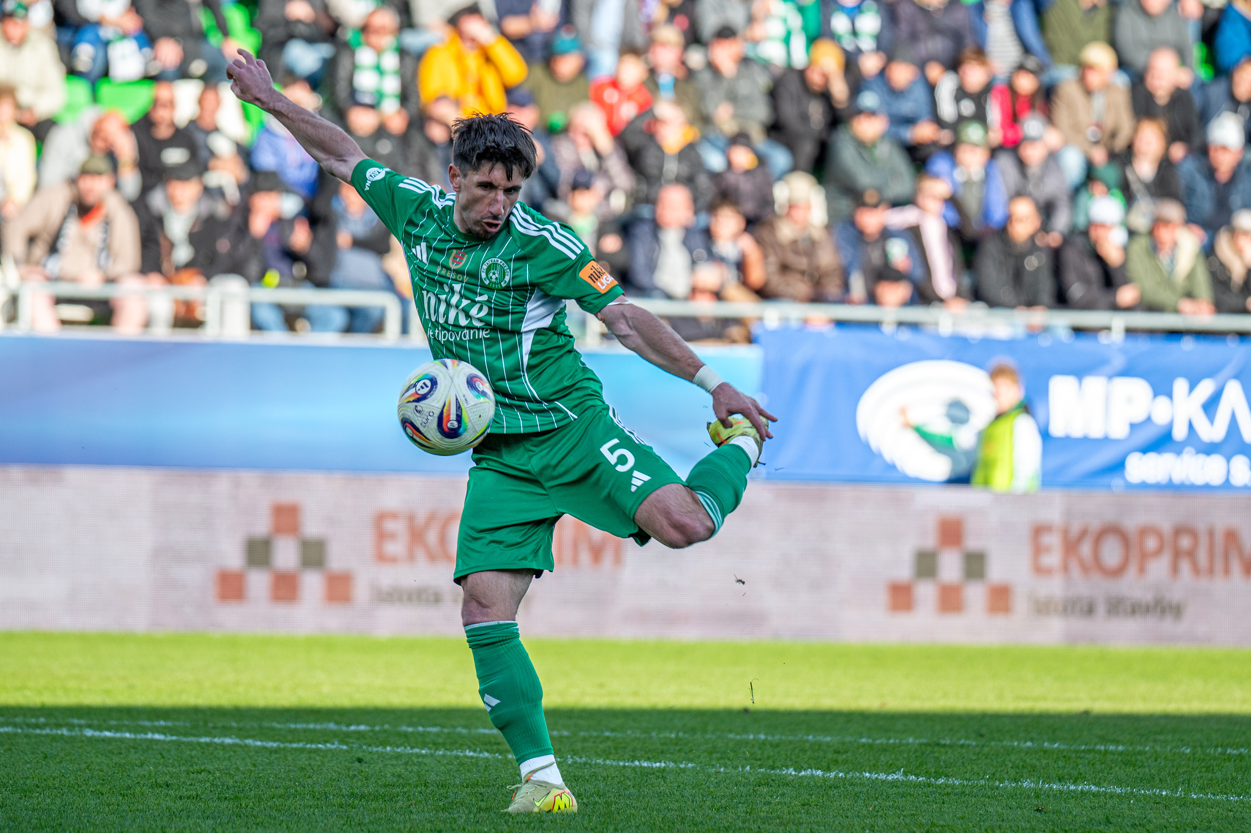 Po Revencovom centri z pravej strany registrujeme v 90+1 Sagnov volej. Letí však mimo tri žrde Slávičkovej brány.
